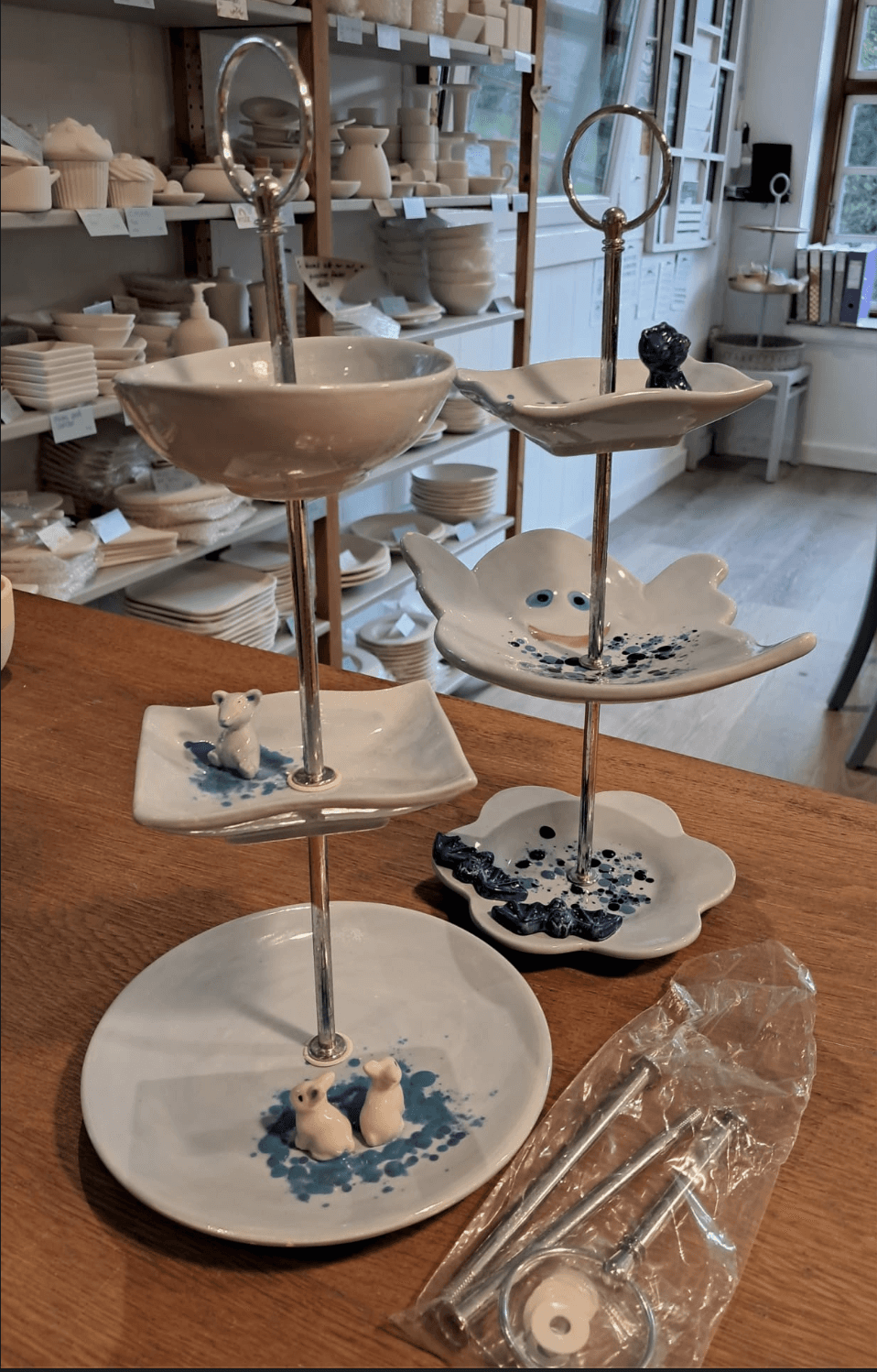Wir bauen unsere eigene Etagere. Du wählst deine 3 Lieblingskeramiken für deine 3-stöckige Etagere aus und bemalst diese. Nach dem Brennen erhältst du eine fertige Etagere mit deiner Lieblingskeramik. Der Workshop dauert 3 Stunden, zur Begrüssung gibt es ein Glas Sekt (mit oder ohne Alkohol). Kosten 14 Euro zuzüglich eurer Keramik.